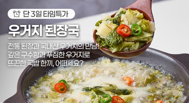 전통된장과 국내산 우거지로 깊은 구수함과 시원함을 느낄 수 있는 우거지된장국