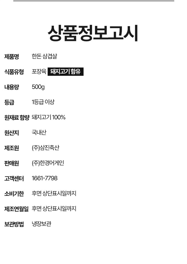 1등급 이상! 국내산 냉장 한돈 삼겹살 500g