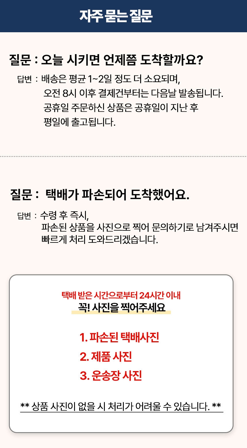 · 배송비 : 4,000원(5개 마다 기본배송비 반복 부과)
